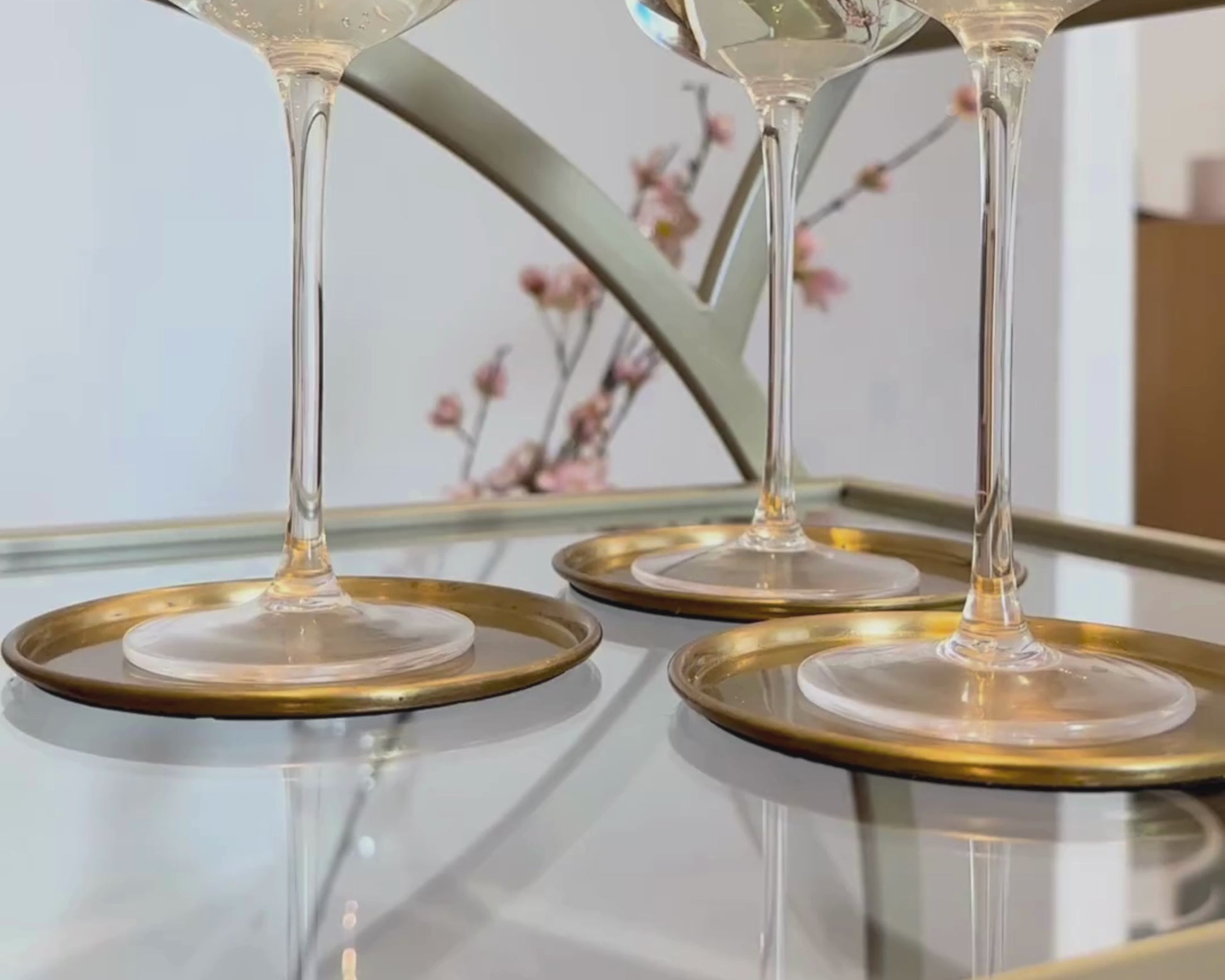 The Indira Brass Coasters Set of 4 are meticulously hand-smithed from high-quality solid brass using time-honoured artisanal techniques. Featuring softly raised edges and a soft protective base on the underside to safeguard tables from scratches and heat marks, these luxury coasters protect surfaces while adding a sophisticated touch to your table. Designed as both practical drink coasters for glasses, cups, or mugs and elegant decorative accents, they are perfect for formal dinners, relaxed evenings, or special occasions. This handcrafted modern coaster set combines beauty and functionality, offering timeless style and long-lasting durability for everyday use or gifting.DisclaimerEach designer coaster is handcrafted, meaning slight variations in colour tone, surface texture, and finish will naturally occur. These differences enhance the unique appeal of antique brass coasters and do not affect functionality.